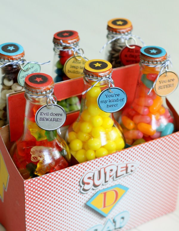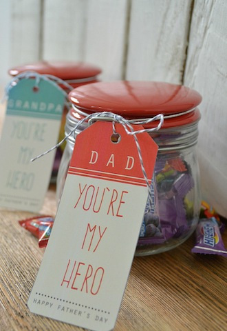 Celebrate the spider killing, boo-boo kissing guy who waits patiently at the bottom of the slide so his cutie pie can slide confidently down, knowing he’ll be there, with this well-earned jar of goodies. Let your little one decide what to fill it with. And find the free printable at Tatertots and Jello.
