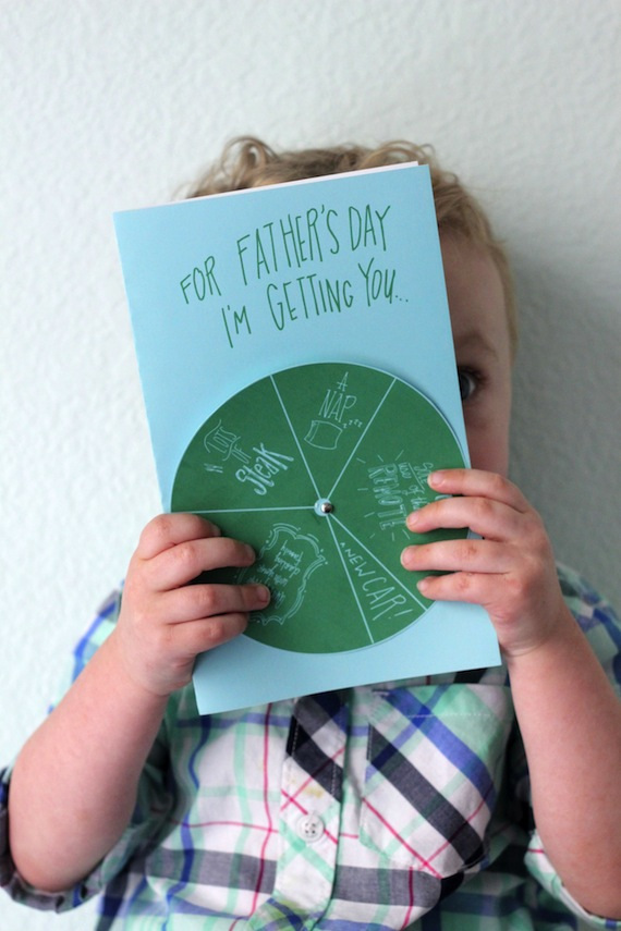 Between a great meal, a nap, a chance to cheer for his favorite team or dad-on-kid quality time, you can keep it simple when deciding on Dad’s gift this year. This printable card from Julep is ready for him to spin the wheel of wish lists and decide just what he wants most for Father’s Day. Card AND gift completed.